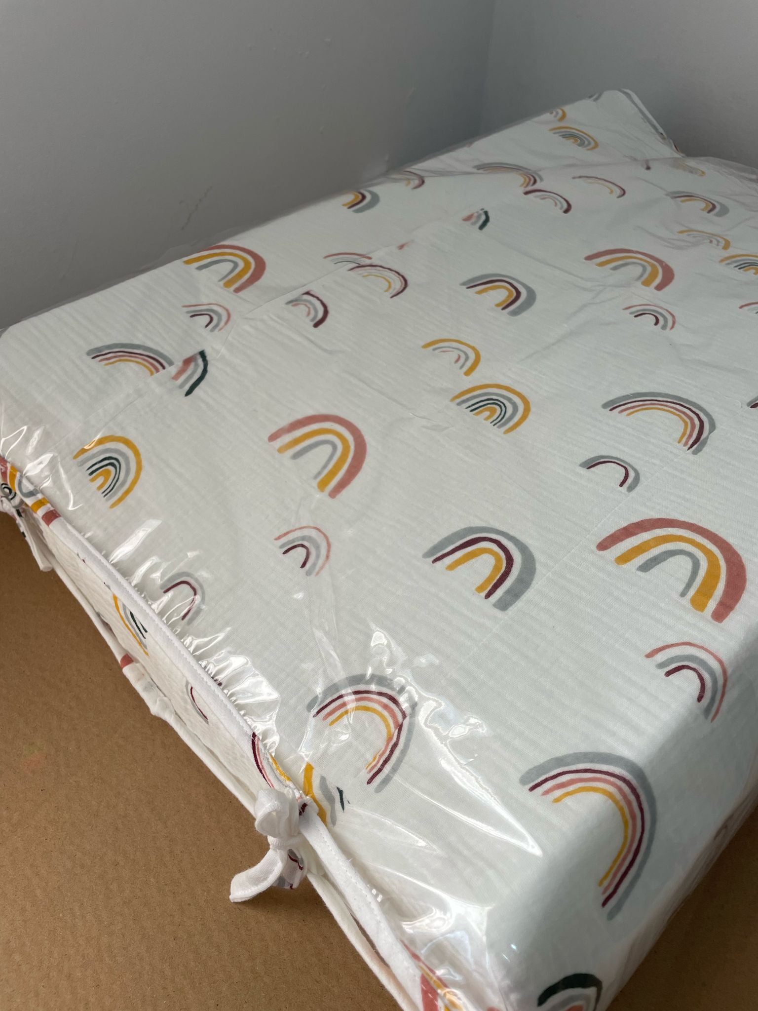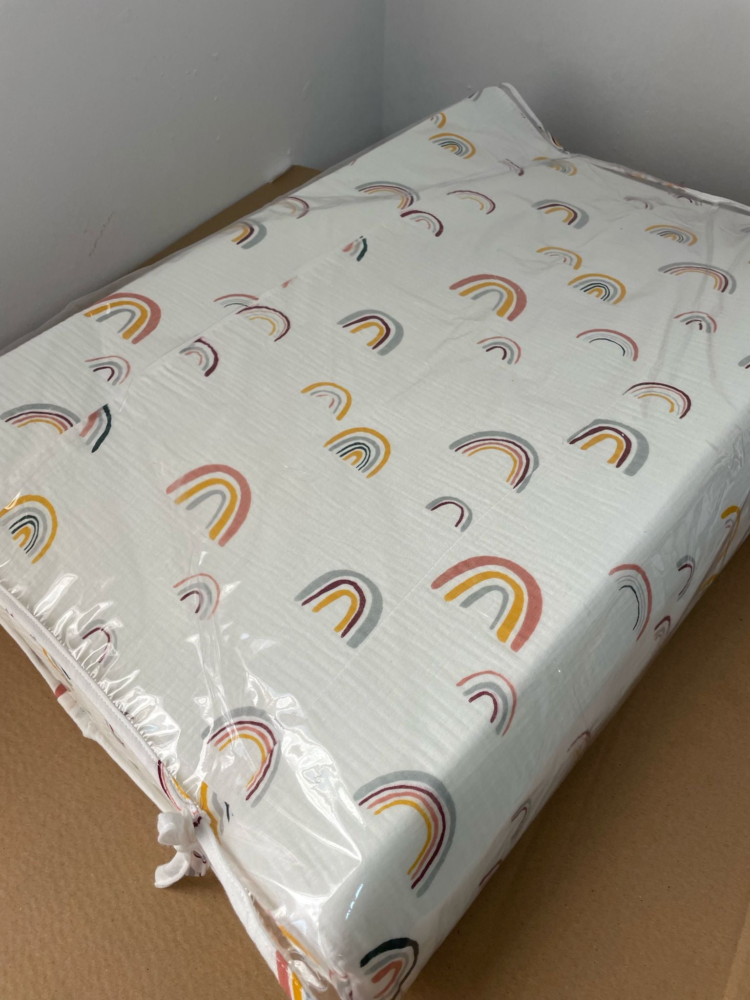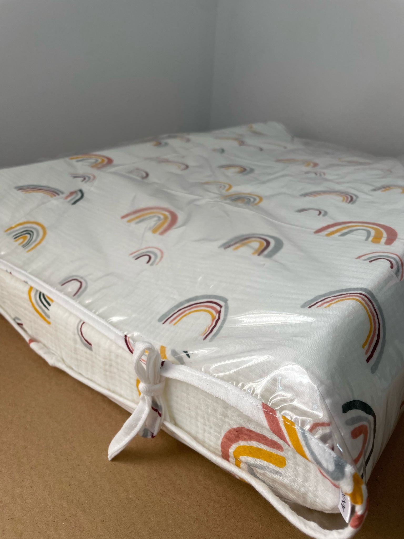 Este cambiador rígido con diseño de arcoíris es perfecto para cuidar a tu bebé. Cuenta con un colchón con cubridor impermeable y bordes más altos para garantizar su seguridad. ¡Cambia a tu bebé con confianza y comodidad!
