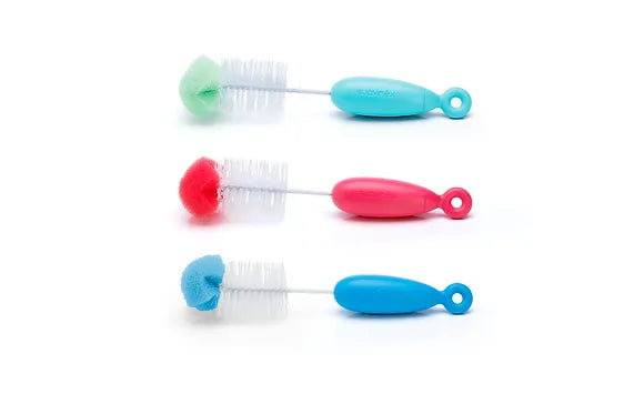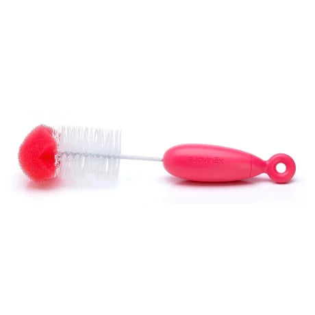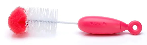 Cepillo limpiabiberones y tetinas (en el extremo del cepillo). Con esponja de alta densidad y fibras que no rallan la cara interna del biberón. Compañero ideal del detergente Suavinex.