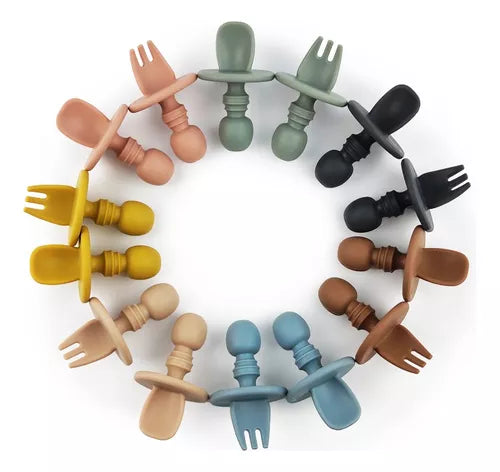 Set de cubiertos cortos y redondeados, diseñados especialmente para la etapa de aprendizaje. De a poco se van familiarizando con los utensilios y el movimiento del plato a la boca, desarrollando así las habilidades motoras.