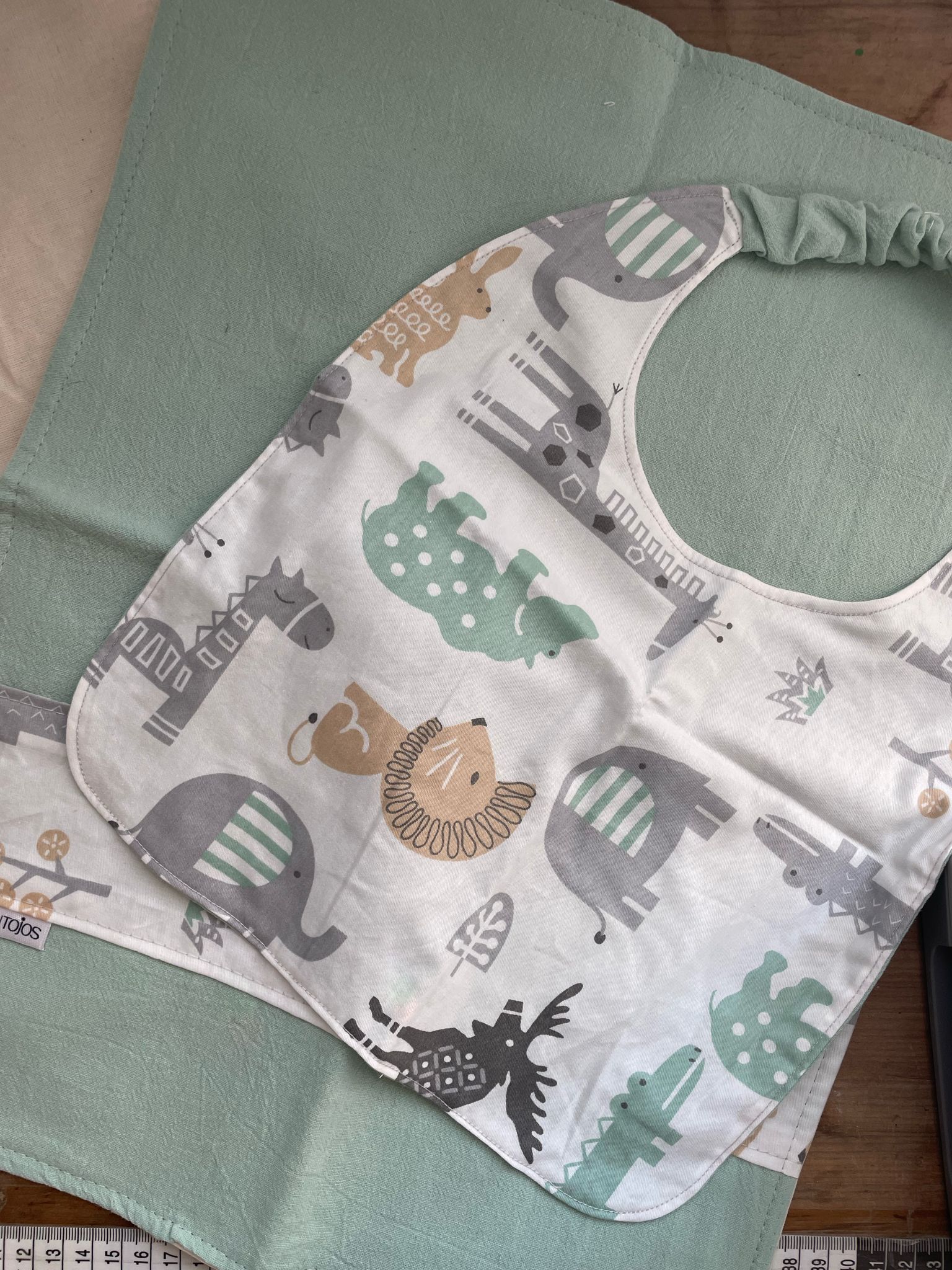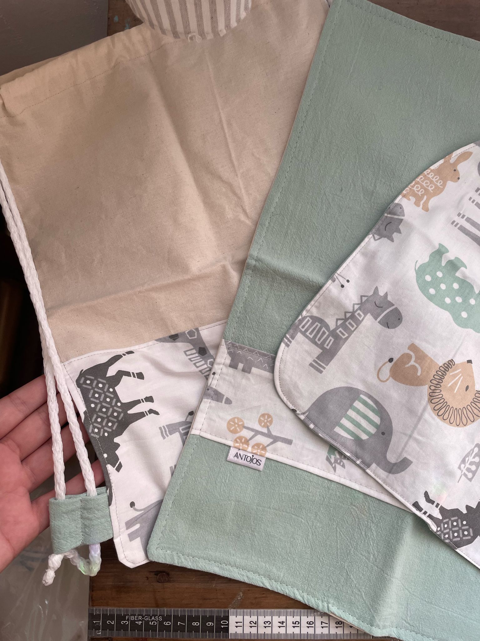 Este kit de jardín para bebés incluye un babero, un mantelito y una mochila de tela con dos cuerdas. Perfecto para la escuela, está diseñado para acomodar un plato, un vaso, una libreta y toalla. ¡Mantén a tu bebé limpio y organizado en sus comidas con este kit!