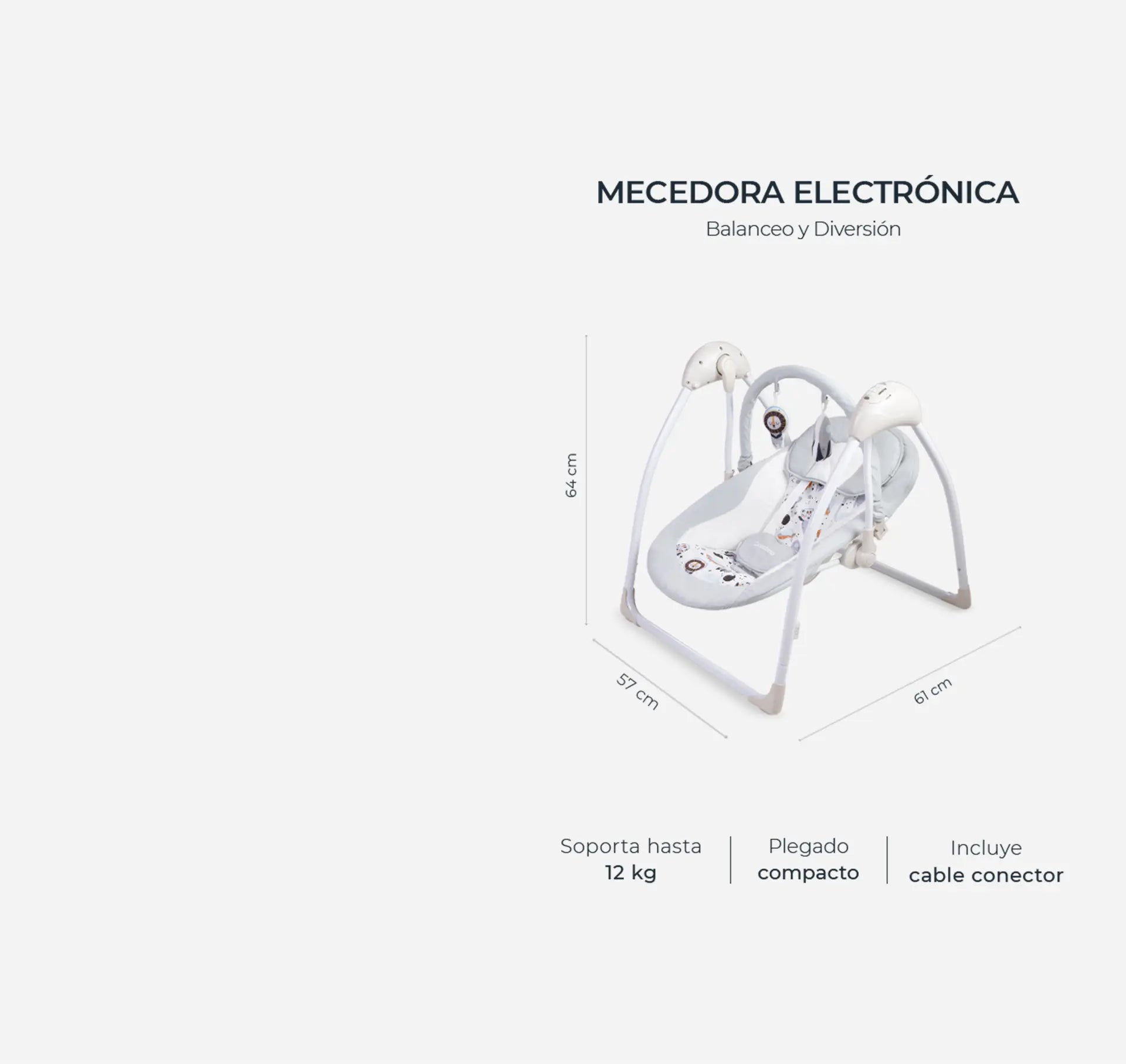 La MECEDORA ELECTRÓNICA está diseñada para ofrecer una experiencia de descanso cómoda y segura. Ideal para bebés desde el nacimiento hasta los 12 kg, esta mecedora no solo proporciona diversión y entretenimiento, sino que también ayuda a calmar el llanto y fomenta el desarrollo sensorial y cognitivo del bebé.