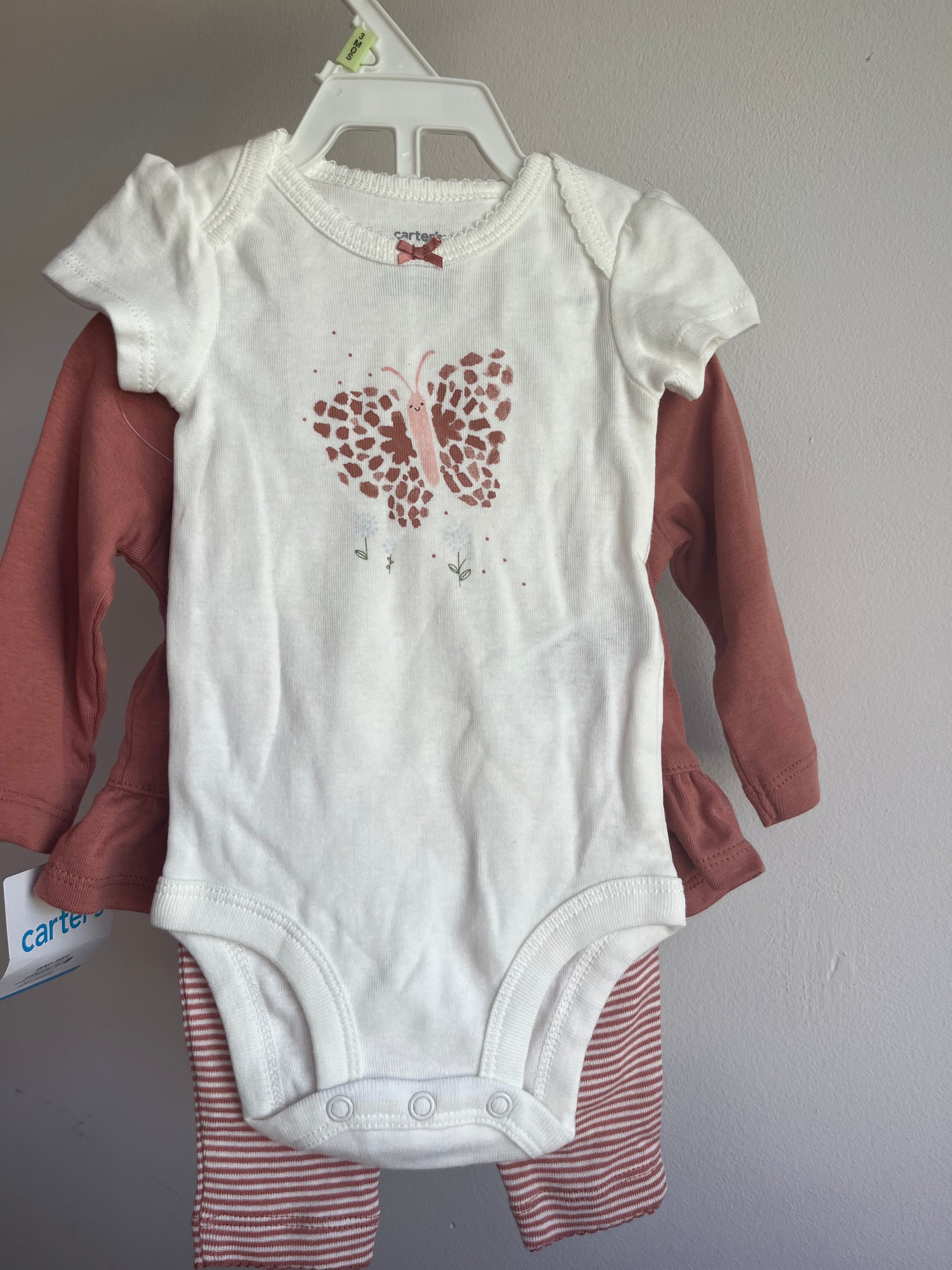 Este set de 3 piezas incluye un saco, un body, y un pantalón con un lindo diseño de mariposa. Hecho especialmente para bebés de 3 meses, este set ofrece comodidad y estilo para tu pequeño/a. La combinación perfecta de moda y funcionalidad. ¡Haz que tu bebé luzca adorable!