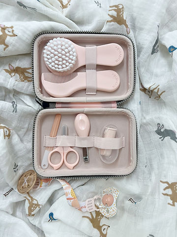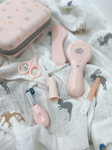 ¡Mantén a tu bebé limpio y saludable con nuestro Set de Higiene nubes rosa! Incluye un cepillo y peine suaves para su delicado cabello, tijera y cortauñas para sus uñas, lima de cristal para suavizar bordes y un cepillo de limpieza de encías. ¡Todo en una adorable caja nube rosa!