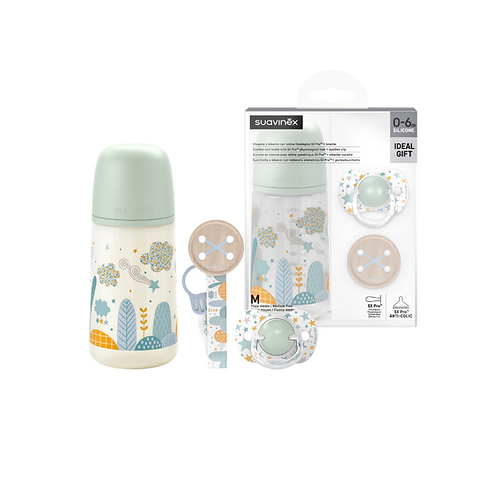 ¡El set de regalo Dream es el regalo perfecto para los nuevos padres! Incluye un biberón de 270ml con flujo medio, tetina Fisiológica SX PRO y válvula anticolicos. También viene con un chupete de 0-6 meses y un broche a juego. ¡Todo lo que necesitas para alimentar y calmar a tu bebé con estilo y comodidad!